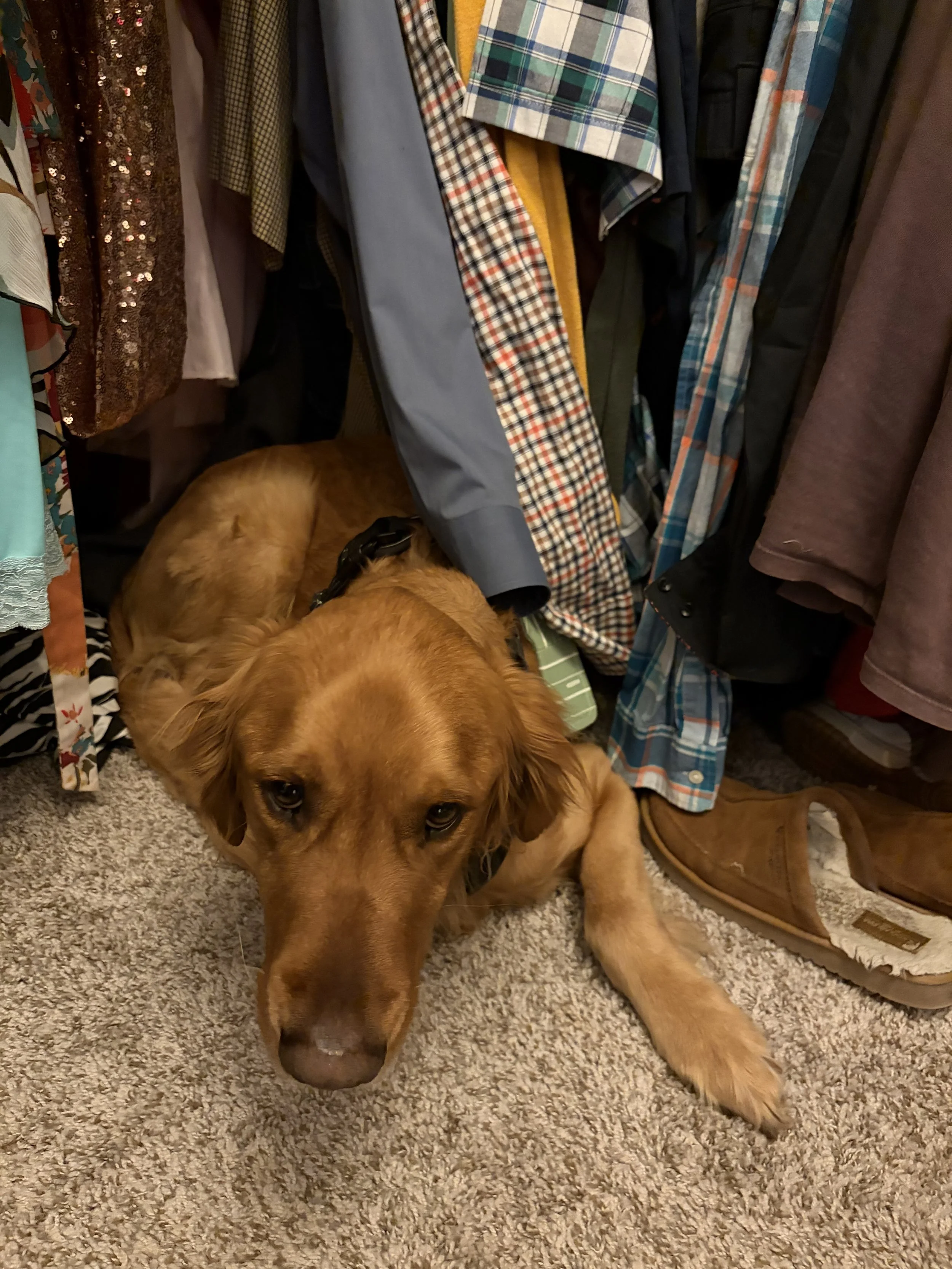 This simple routine has made a noticeable difference. Leonard still prefers the closet during fireworks, but instead of burying himself behind the clothes, he’s now able to relax in the middle of the closet. That might sound small—but for us, it’s huge progress.
